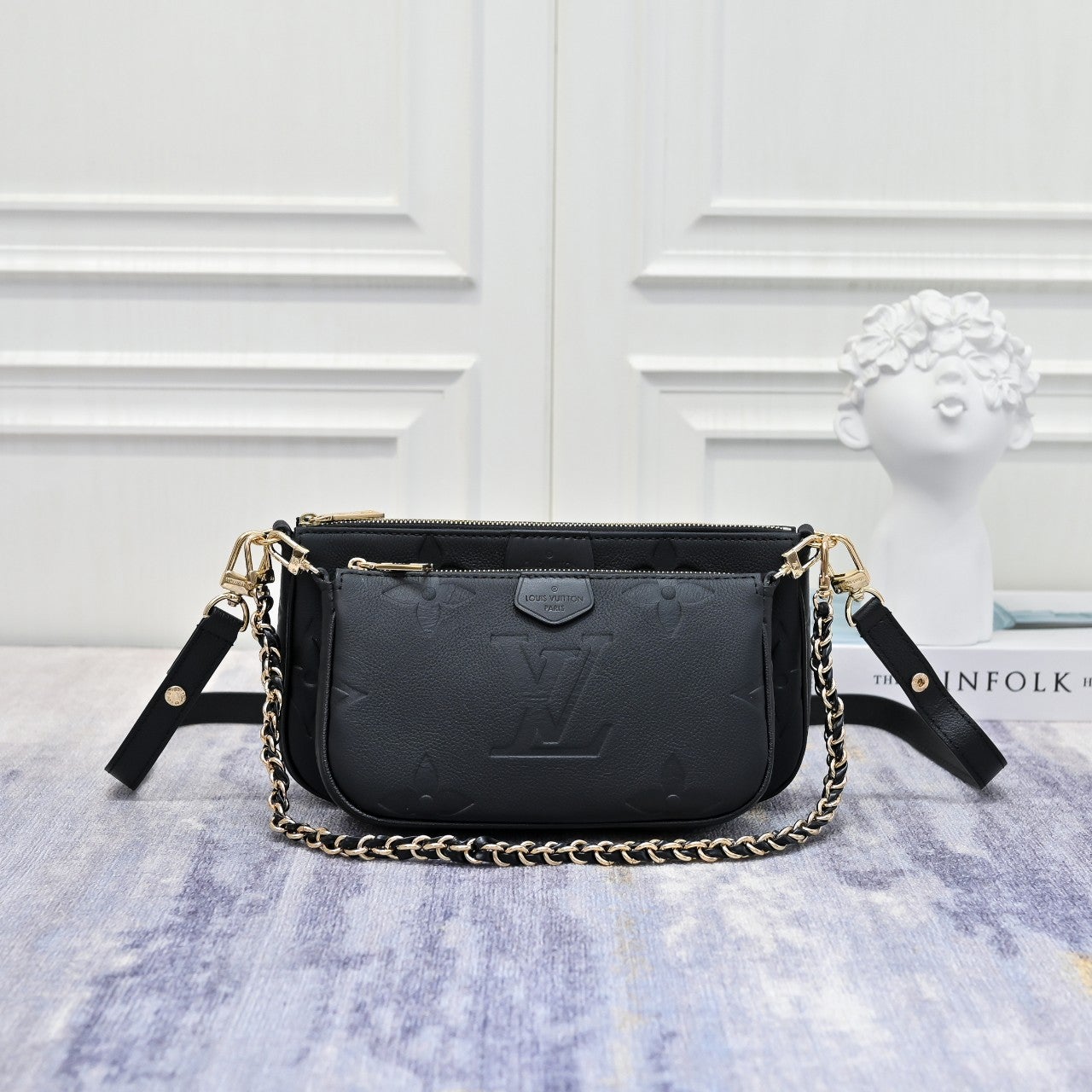 디자인과 기능성의 조화가 돋보이는 모노그램 앙프렝뜨 가죽 소재의 멀티 포쉐트 악세수아(Multi Pochette Accessoires) 크로스 바디 백. 두 개의 파우치, 골드 색상의 체인, 가죽 스트랩 등 모든 요소가 탈착 가능한 투인원 시스템. 앞면의 양각 오버사이즈 모노그램과 옆면 거싯 부분의 클래식한 모노그램 패턴이 완벽한 대비를 이루는 디자인.