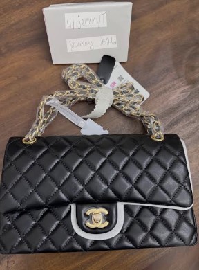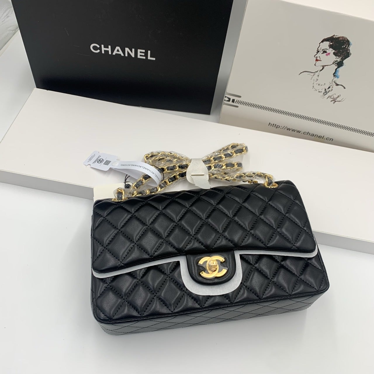 플랩의 퀼팅 패턴 대칭이 일정하며 화이트 라이닝 마무리가 정교합니다. 금속 체인과 로고의 도금 상태가 우수하여 완성도가 높네요.