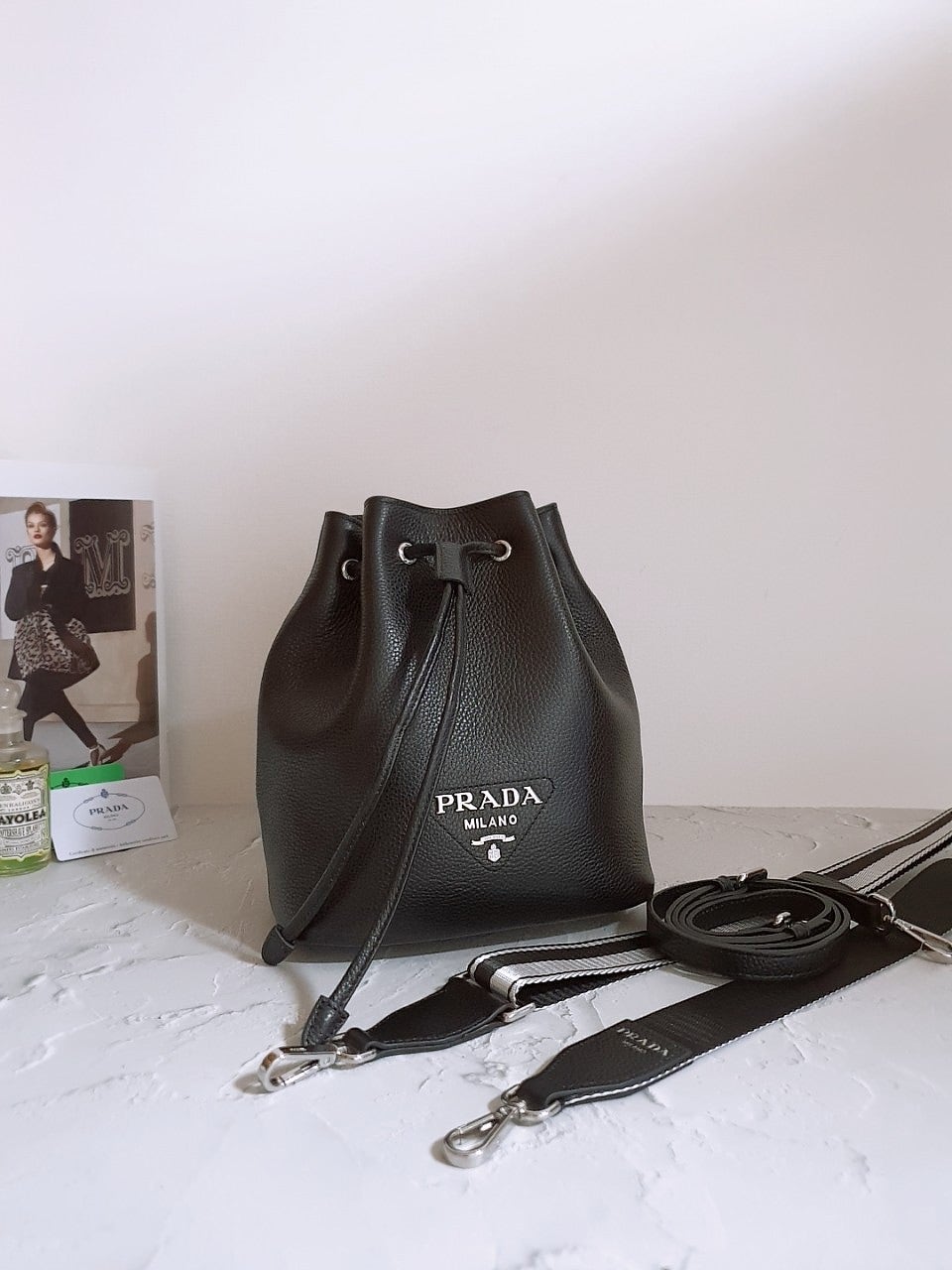 프라다 가죽 플로 버킷 백